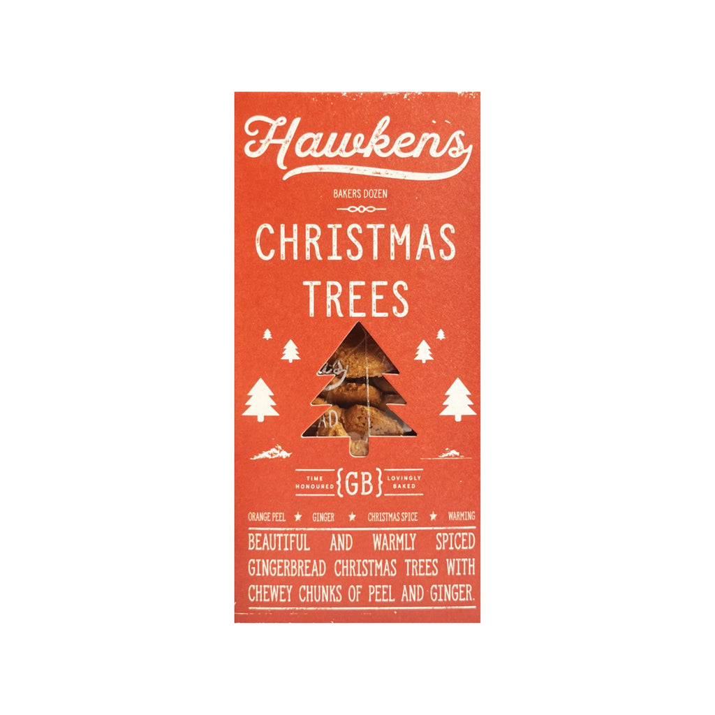 A box of Gingerbread Christmas Trees with chewy chunks of peel and ginger.